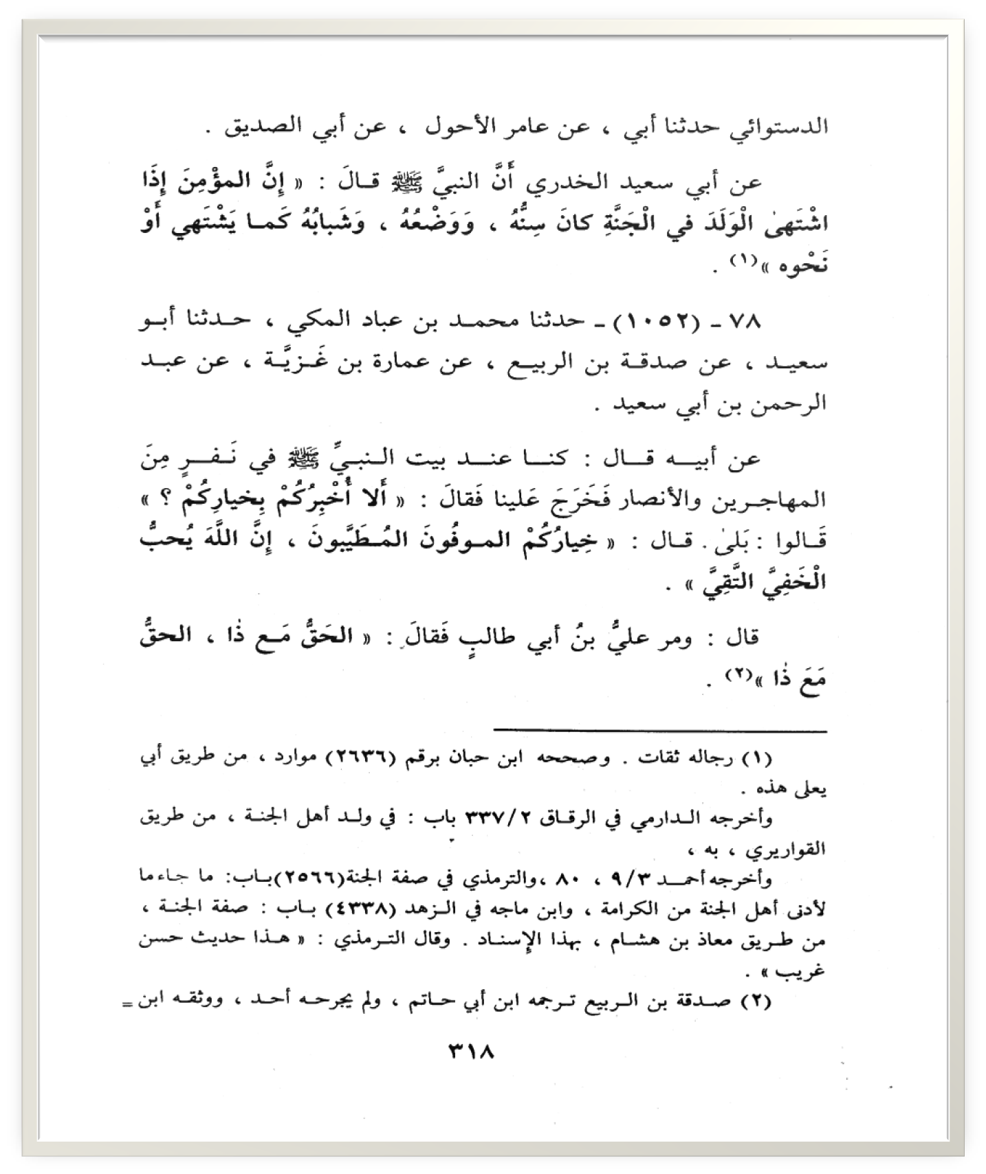 حَدَّثَنَا مُحَمَّدُ بْنُ عَبَّادٍ الْمَکِّیُّ، حَدَّثَنَا أَبُو سَعِیدٍ، عَنْ صَدَقَةِ بْنِ الرَّبِیعِ، عَنْ عُمَارَةَ بْنِ غَزِیَّةَ، عَنْ عَبْدِ الرَّحْمَنِ بْنِ أَبِی سَعِیدٍ، عَنْ أَبِیهِ قَالَ: کُنَّا عِنْدَ بَیْتِ النَّبِیِّ صَلَّى اللهُ عَلَیْهِ وَسَلَّمَ فِی نَفَرٍ مِنَ الْمُهَاجِرِینَ وَالْأَنْصَارِ، فَخَرَجَ عَلَیْنَا فَقَالَ: «أَلَا أُخْبِرُکُمْ بِخِیَارِکُمْ؟»، قَالُوا: بَلَى، قَالَ:«خِیَارُکُمُ الْمُوفُونَ الْمُطَیَّبُونَ، إِنَّ اللَّهَ یُحِبُّ الْخَفِیَّ التَّقِیَّ»، قَالَ: وَمَرَّ عَلِیُّ بْنُ أَبِی طَالِبٍ فَقَالَ: «الْحَقُّ مَعَ ذَا، الْحَقُّ مَعَ ذَا»