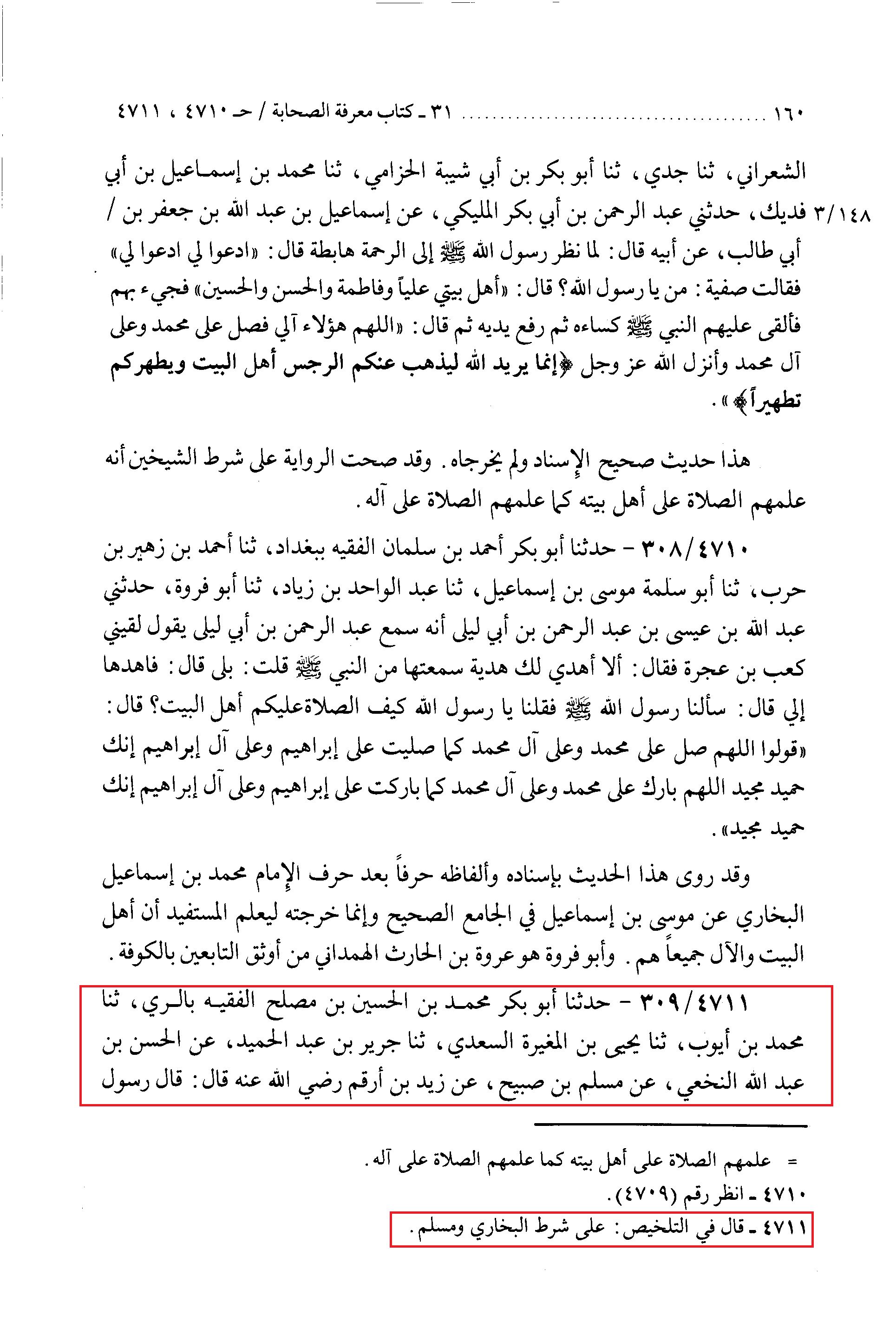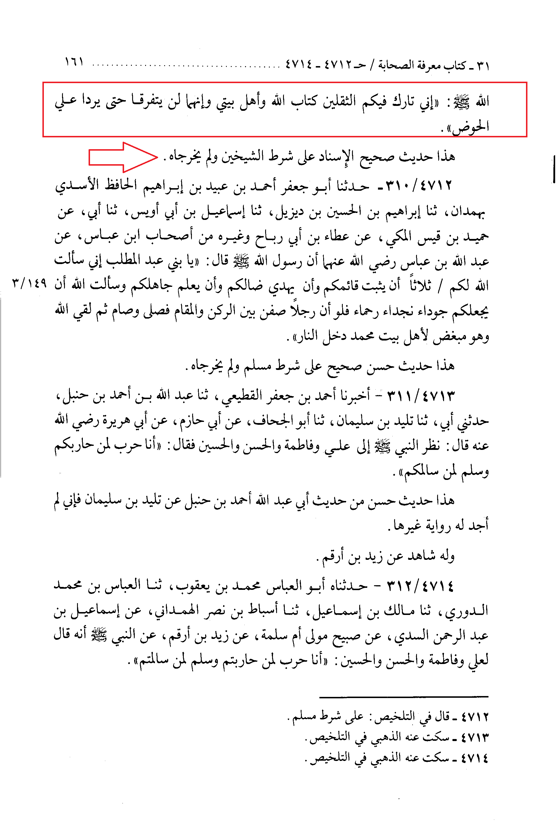 4711 - حَدَّثَنَا أَبُو بَکْرٍ، مُحَمَّدُ بْنُ الْحُسَیْنِ بْنِ مُصْلِحٍ الْفَقِیهُ بِالرِّی، ثَنَا مُحَمَّدُ بْنُ أَیُّوبَ، ثَنَا یَحْیَى بْنُ الْمُغِیرَةِ السَّعْدِیُّ، ثَنَا جَرِیرُ بْنُ عَبْدِ الْحَمِیدِ، عَنِ الْحَسَنِ بْنِ عَبْدِ اللهِ النَّخَعِیِّ، عَنْ مُسْلِمِ بْنِ صُبَیْحٍ، عَنْ زَیْدِ بْنِ أَرْقَمَ، رَضِیَ اللَّهُ عَنْه، قَالَ: قَالَ رَسُولُ اللهِ صَلَّى اللهُ عَلَیْهِ وَسَلَّمَ: إِنِّی تَارِکٌ فِیکُمُ الثَّقَلَیْنِ: کِتَابَ اللهِ، وَأَهْلَ بَیْتِی، وَإِنَّهُمَا لَنْ یَتَفَرَّقَا حَتَّى یَرِدَا عَلَیَّ الْحَوْضَ.