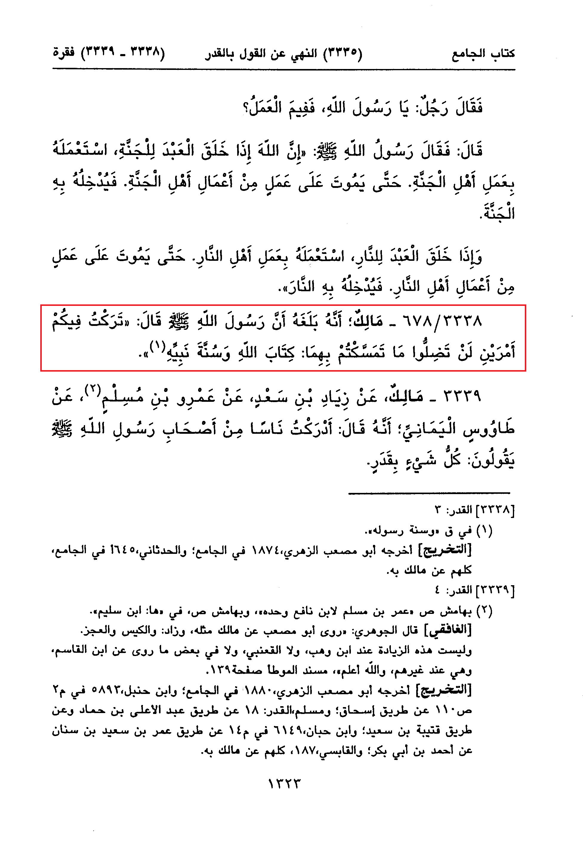 3338/ 678 - مَالِکٌ؛ أَنَّهُ بَلَغَهُ أَنَّ رَسُولَ اللهِ صلى الله علیه وسلم قَالَ: «تَرَکْتُ فِیکُمْ أَمْرَیْنِ لَنْ تَضِلُّوا مَا تَمَسَّکْتُمْ بِهِمَا: کِتَابَ اللهِ وَسُنَّةَ نَبِیِّهِ (1)».